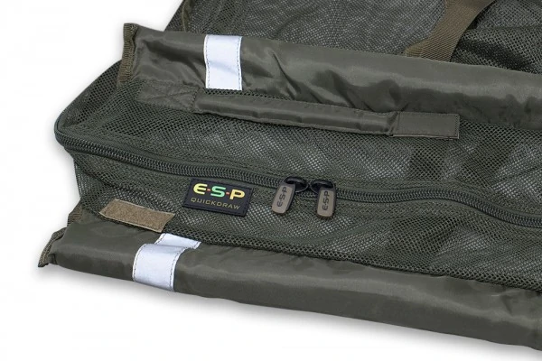 ESP Quickdraw Retainer Sling The ESP Quickdraw Retainer Sling provides minimal pack down bulk while offering safe short term retention for the largest of carp. PRODUCT INFORMATION Measuring 1070mm long x 560mm deep with full length low diameter foam covered super strong fibreglass support bars. The soft olive green mesh ensures excellent water flow and fold out separator bars across the top of the sling provide plenty of width. The strong webbing handles are an optimum length for weighing big fish and a high quality two way zip ensures the carp is safely secured while the camera equipment is prepared.…