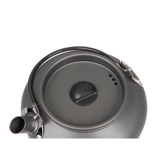 Product Information 0.9l lightweight hard anodized aluminum kettle. Folding handle. Supplied in mesh drawstring bag.