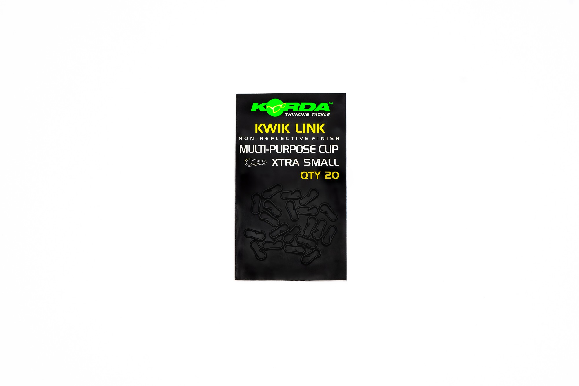 This really is a multi-purpose link, which allows you to change hook links or leads in the blink of an eye. The shape of the clip makes it very easy to attach and detach things such as leads, swivels or hook link looks, even with cold hands or in the dark. Use a Tapered Sleeve, or similar, over it for a neater, more secure finish, especially when using to attach a hook link. The Kwik Link has a non-reflective finish. Available in small or extra small sizes, in a pack of 20.