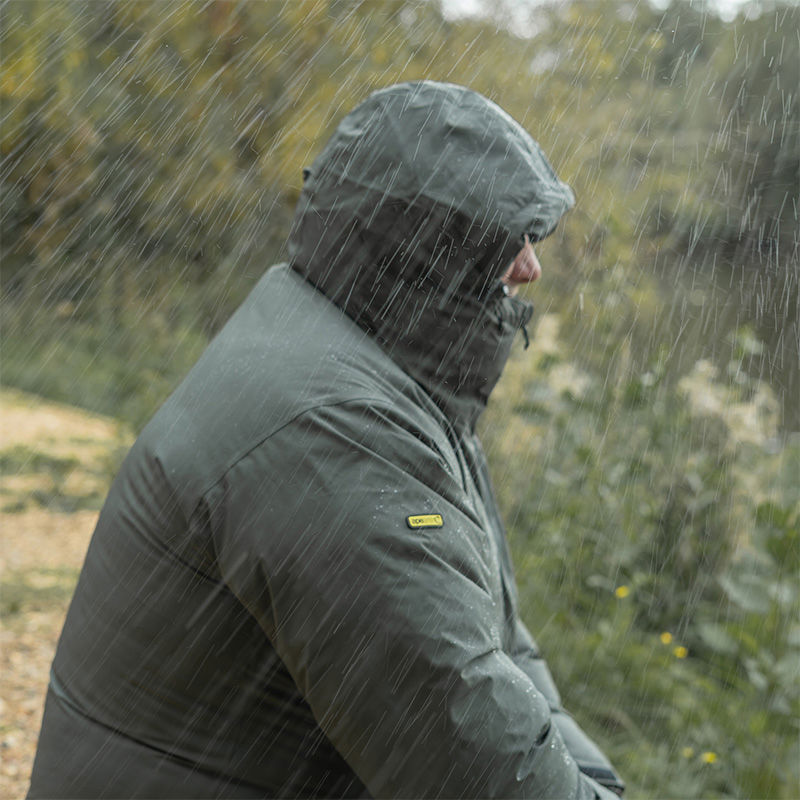 waterproof panels backed by an impermeable membrane, a large padded hood with 3-point adjustment and fully waterproof zipped pockets.