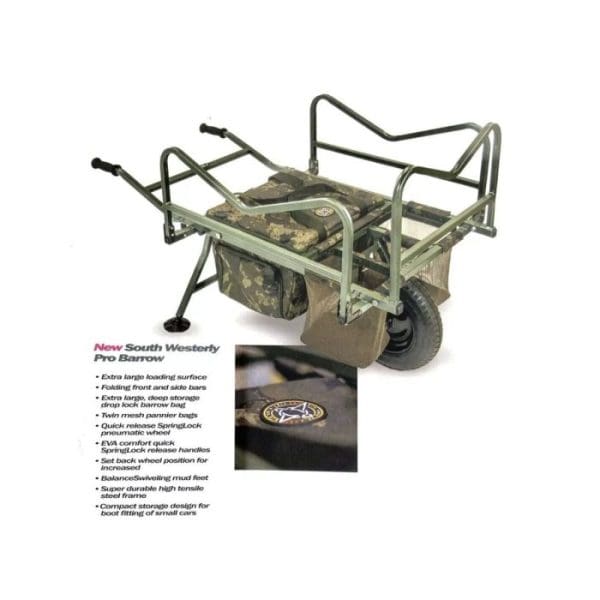 The Solar South Westerly Pro Barrow is a very solid and reliable wheelbarrow for the carp angler. With maximum loading space, foldable extending front and sides and strong profile tire, this barrow is made of high-quality steel. The Solar South Westerly Pro Barrow New comes with 3 bags and mud feet!